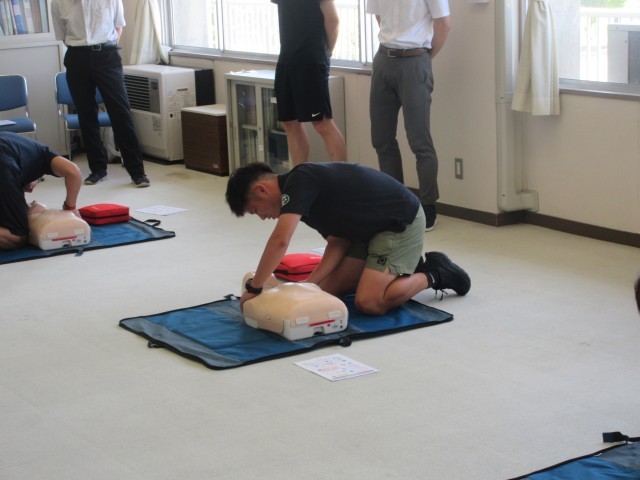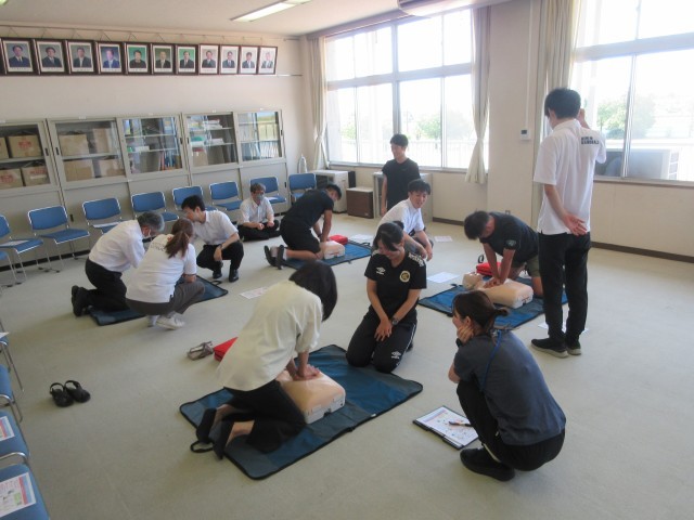 心肺蘇生の方法の流れを確認したり、実際に傷病者がいたときを想定して、グループごとに役割を決めて実践したりしました。