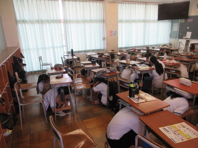 藤ノ木中学校では、昼休みが終わった後の5時間目開始後に、全校でこの訓練を実施しました。