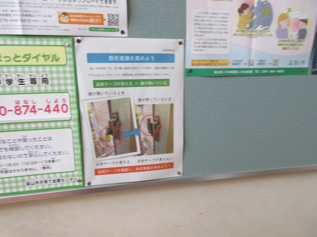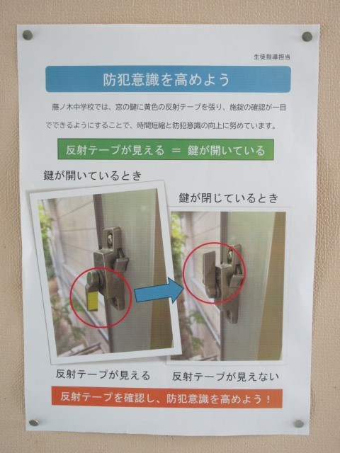 藤ノ木中学校では、窓の鍵に黄色の反射テープを張り、施錠の確認が一目でできるようにすることで、防犯意識の向上に努めています。