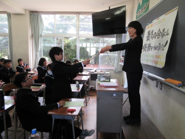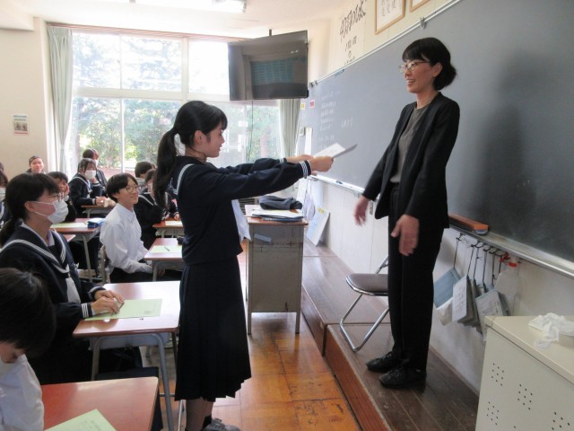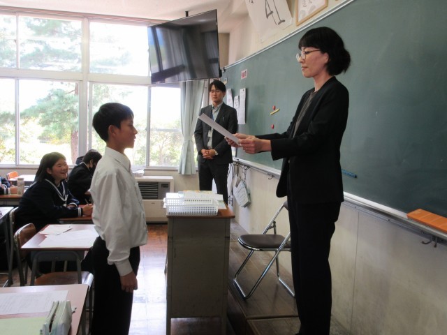 5限目の途中に1学年主任が最優秀賞がとれなかったクラスを回り、クラスを代表して指揮者に特別賞の賞状を授与しました。