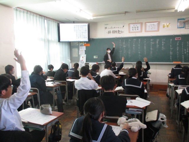 11月17日(月)1学年 授業風景 公開日 2025/11/18 更新日 2025/11/17 1学年 1学年の授業の様子を紹介します。【画像1】国語:故事成語【画像2】英語:現在進行形の文をつくる方法を身につけよう【画像3】数学:反比例【画像4】保健体育:バスケットボール +1 1学年