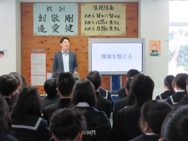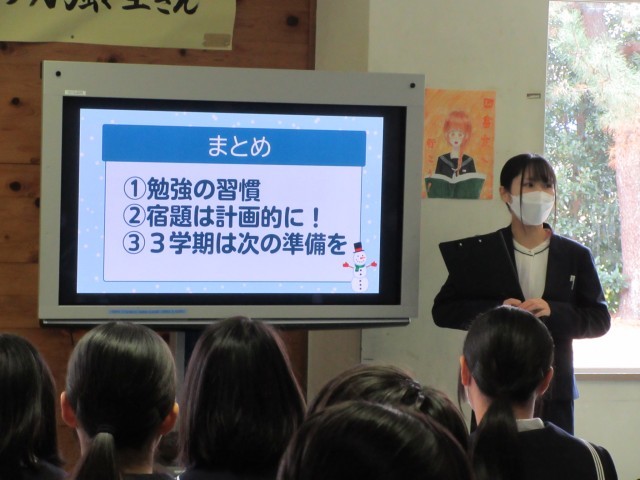 生徒指導担当から冬休みの生活について、学習担当から1年生の学習内容の大切さ、学年主任から2学期を振り返っての話がありました。