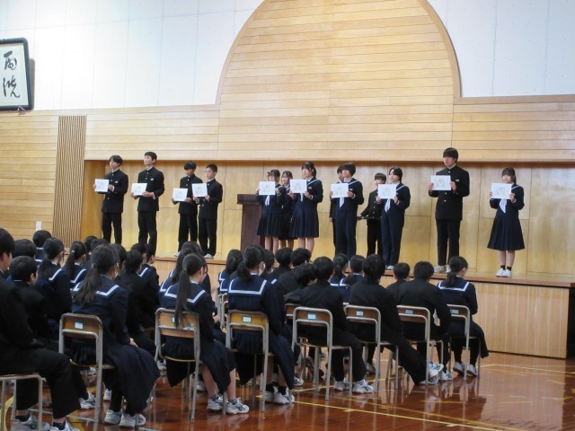 3月19日(木) 生徒会役員任命式 公開日 2026/03/20 更新日 2026/03/19 news 6限に生徒会役員任命式がありました。前期生徒会役員が任命証を受け取り、今年度の後期生徒会役員から引継ぎを行いました。校長先生からは、今後の生徒会活動がさらに活発なものとなるように、激励の言葉がありました。来年度も「考え、行動する藤中生」として、より良い学校づくりをしていきましょう! +1