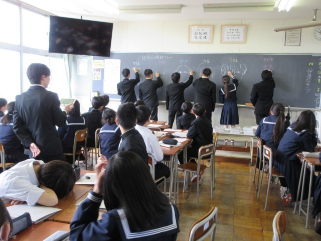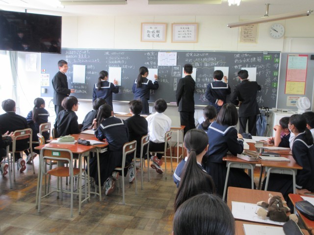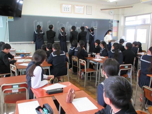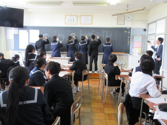 各班で協力して行う「担任似顔絵リレー」をし、6班6様の似顔絵が仕上がって大盛り上がりでした。