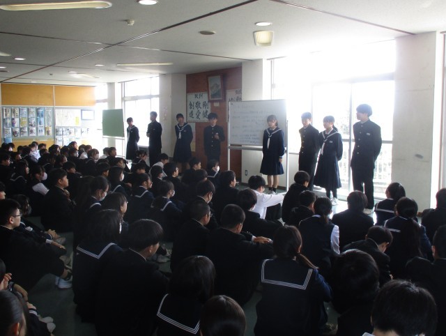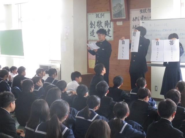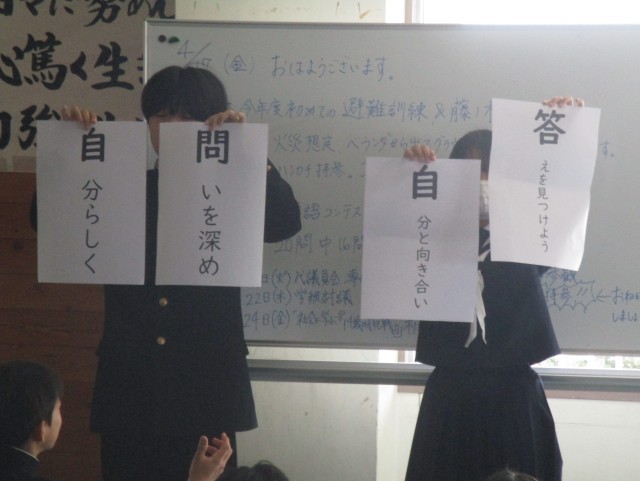 4月17日(金) 2学年 学年集会 公開日 2026/04/18 更新日 2026/04/17 2学年 2年生は、1限目に学年集会を行い、学年生徒会から学年目標を発表しました。先生の願いでもある「自立・自律を身につけよう」を元につくりあげた「自問自答」という学年目標には、生徒自らで考えた深い意味があります。この一年間での大きな成長を期待しています! 2学年