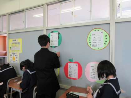 2年生は班活動の係決めを行いました。どのクラスも和やかな雰囲気で話し合っていました。掲示物を工夫しているクラスもありました。