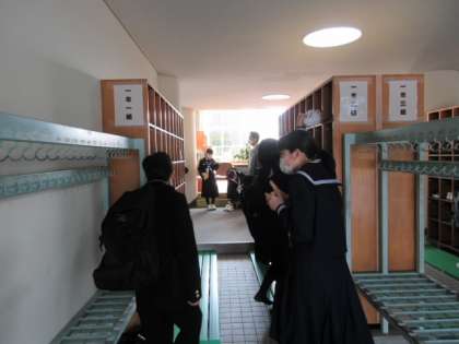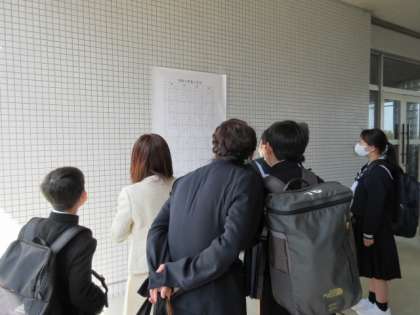 どきどきした様子でクラス発表の掲示を見た後、3年生の誘導で校舎内に入りました。