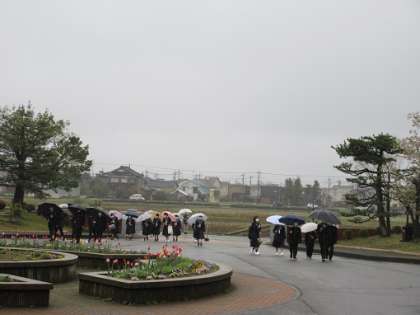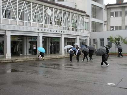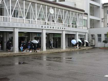 生徒玄関前では、毎朝教員が生徒たちを元気な挨拶で出迎えています。