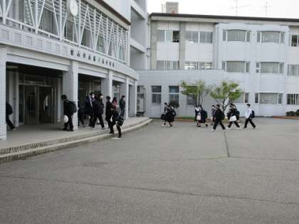 今朝も生徒玄関前で教職員と生徒の「活力ある」あいさつが交わされていました。