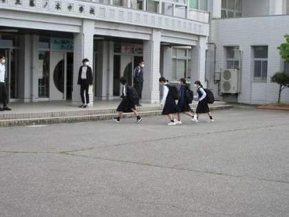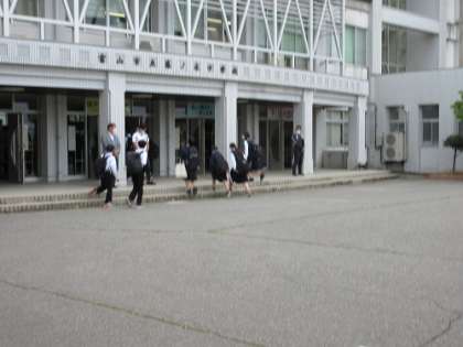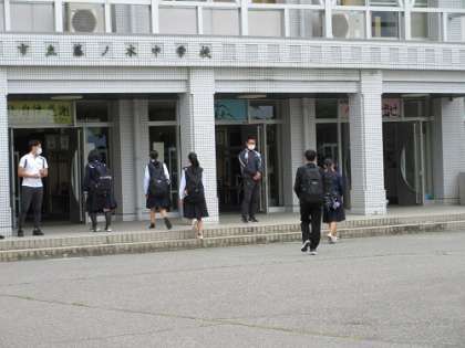 生徒玄関前では、各学年のスタッフが出迎えています。