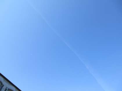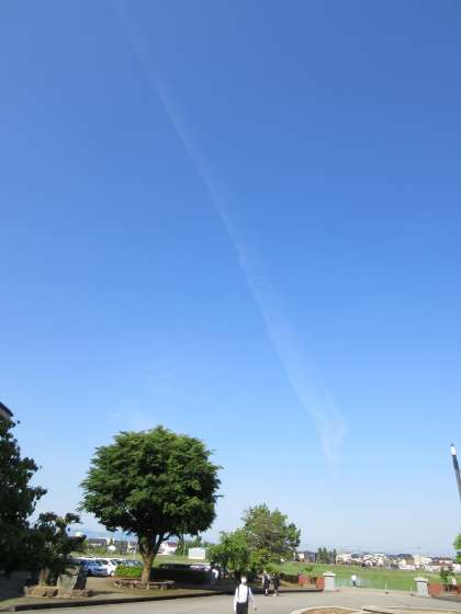 今朝は、青空に一筋の飛行機雲が縦断していました。