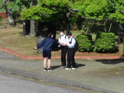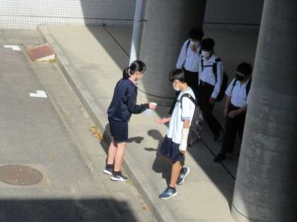 今朝、生徒会執行部と保健委員会がコラボして校門と生徒玄関前で登校してくる生徒たちに手指消毒を呼びかけました。