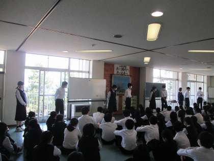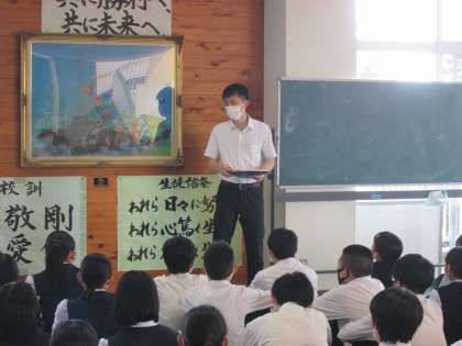 6月2日(木) 3年6限 「総合的な学習の時間」 公開日 2022/06/02 更新日 2022/06/02 3学年 本日3年生は6限の「総合的な学習の時間」で学年集会を行いました。 前半は、学年リーダー(会長等)の発表の後、生徒会担当者から体育大会でリーダーになるための心得について話がありました。 リーダーに立候補するかどうかにかかわらず、今回の話を1つのきっかけにして、最上級生として気持ちを新たに、頑張っていってほしいと思います。