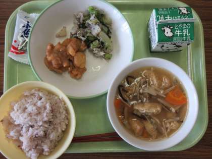 6月6日(月) 今日の給食 公開日 2022/06/06 更新日 2022/06/06 news 今日の給食のメニューは以下のとおりです。 ○雑穀入りごはん 〇牛乳 〇鶏肉のから揚げ ○ゆかり和え ○すいとん ○味付け小魚 今日の「すいとん」は、具だくさんで食べ応えがあり、おいしかったです。