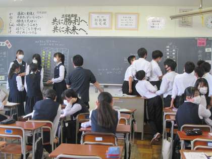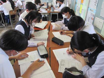 今日の総合では、修学旅行のバス座席決めを行いました。また、期末考査の範囲表を見てテスト勉強の計画を立てました。