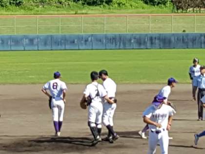 前半は、本校生徒の連続ヒットで、2−1とリードしています。中川監督がマウンドに向かい内野手への指示もありました。