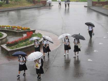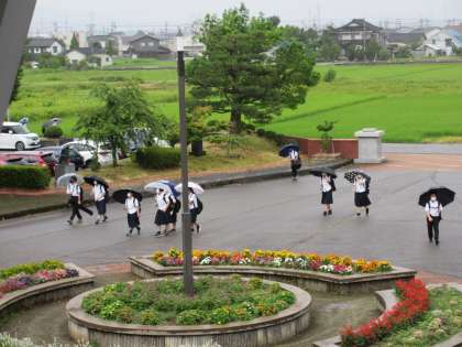 今朝は一時的に激し雨となり、傘をさしていても濡れてしまう状況でした。生徒玄関では、靴下を履き替えている生徒もいました。