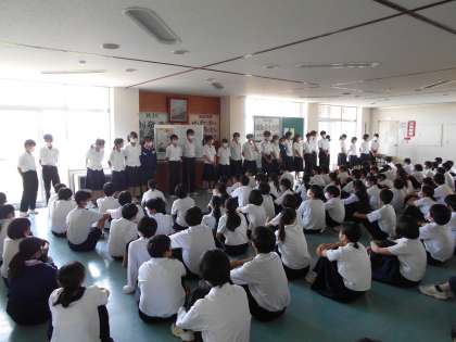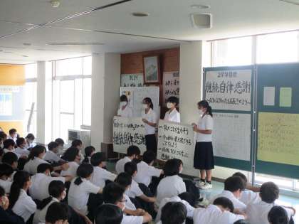 7月8日(金)2年学年集会 公開日 2022/07/08 更新日 2022/07/08 2学年 本日の4限に学年集会を行いました。内容は「社会に学ぶ『14歳の挑戦』」のスローガン発表と実行委員の紹介です。実行委員が中心になり、14歳の挑戦に関する様々なことに取り組んでいます。このスローガンも実行委員が作ってくれました。ありがとうございます。これからもよろしくお願いします。