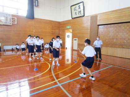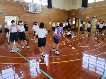 お玉の上にピンポン球を入れて、落とさないように運びました。