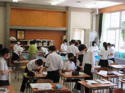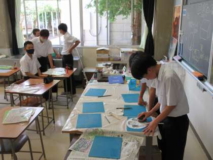7月14日(木) 2年1組 美術 公開日 2022/07/14 更新日 2022/07/15 3学年 本日の2年生の授業の様子です。 2年1組は、美術で「和紙染めうちわづくり」を行っています。 とても風情のある作品が仕上がってきています。