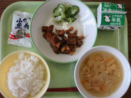 「五目みそ汁」には、うす揚げ、ジャガイモ、ニンジン、タマネギ、ネギが入っていました。