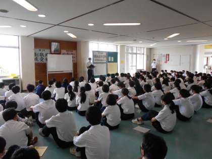 1学期最後の学年集会では、夏休み中の「生活面」「安全面」「学習面」について話をしました。学年全員が静かに集中して話を聞いていました。