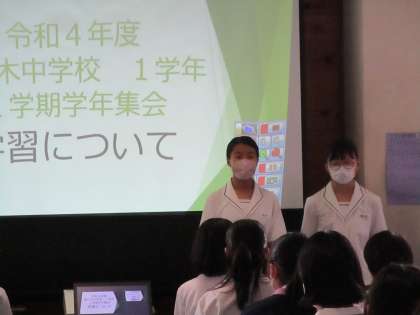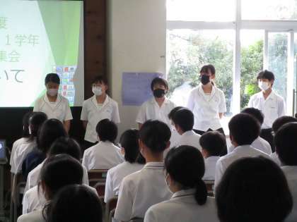終業式の後、1年生は学年集会をしました。まず初めに、学年企画の生徒たちと学年代表から1学期の振り返りがありました。どのクラスも仲良く明るく過ごせていたが、授業とのメリハリが付けられるとさらに良くなるという内容が多かったです。