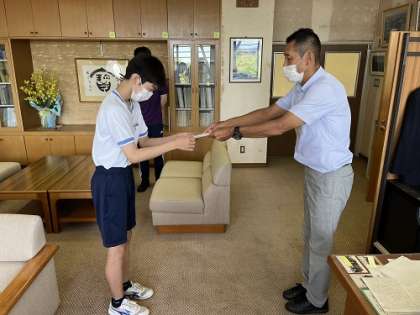 教育後援会ならびにPTA「藤波の会」からの激励費を鍋田校長が手渡しました。