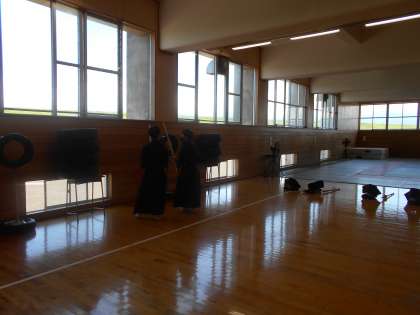 剣道部は柔剣道場で練習をしていました。 タイヤに向かって竹刀を振る練習を行っていました。