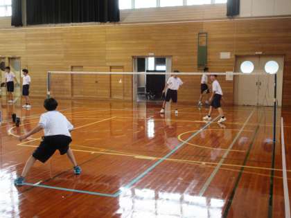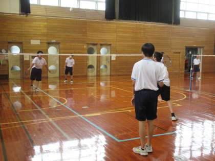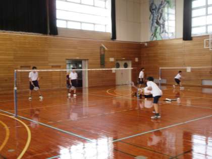 男子バドミントン部は、体育館半面で3コートを使用して練習をしていました。