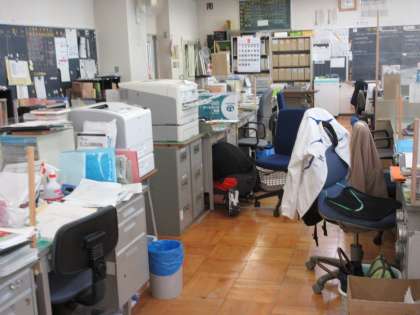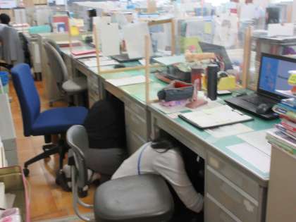 職員室でも教職員が机の下に入り訓練を行いました。