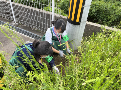 1枚目は「Vドラッグ町村店」での活動写真です。店先の草刈りをして、環境を整えたいました。
