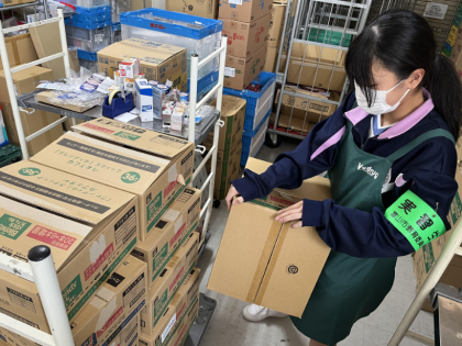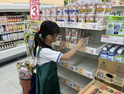2、3枚目は「Vドラッグ藤木店」での活動写真です。手にとってもらいやすいよう品出しをしたり、品出し後の段ボールの整理をしたりしました。