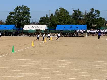 1年生は、2人ペアで棒を持ち、気持ちを合わせてコーンを周り、リレー形式で走っています。