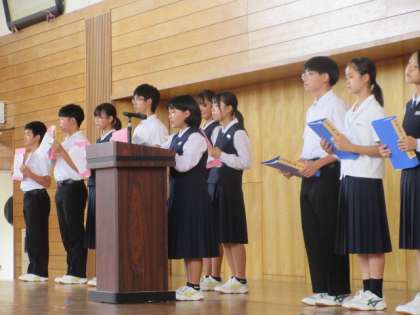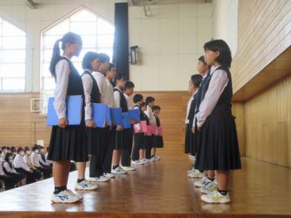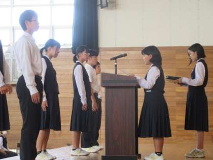 10月4日(火)後期生徒会役員認証式、任命式 公開日 2022/10/04 更新日 2022/10/04 news 認証式のあと、後期生徒会長から委員長等に任命書が渡されました。 後期生徒会長からは、自分から挨拶ができるよう「挨拶運動」や「生徒会新聞の発行」、他学年と交流できるように「レクリエーション活動」をしたいと考えており、藤中生全員で最高の学校をつくっていこうと決意を述べました。 みんなが過ごしやすい、明るく楽しい藤中をつくっていきましょう!