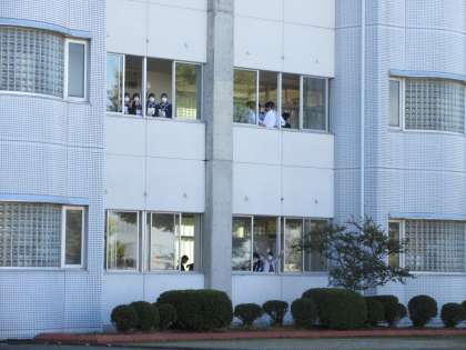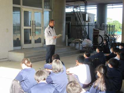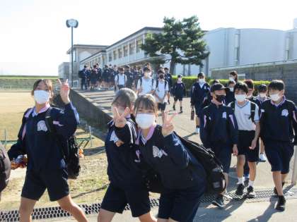 引率の先生から「安心、安全に気を配り、行ってよかったと思える1日にしましょう」という話があり、どの生徒も真剣に聞いていました。出発式が終わり、1、3年生に見送られ、みんないい笑顔で学校を出発しました。