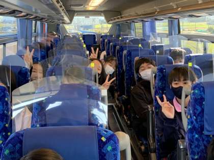 バスは、国道8号線を進んでいます。道は混んでいますが、生徒たちは楽しそうです。