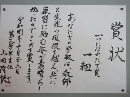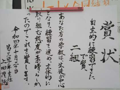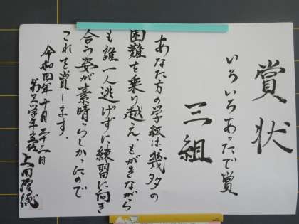 3年 合唱コンクール 学年賞状 公開日 2022/10/30 更新日 2022/10/30 3学年 先週の合唱コンクールで、賞をもらえなかったクラスには学年主任から各クラスのよいところを讃える手作り賞状が贈られ、教室に掲示してあります。