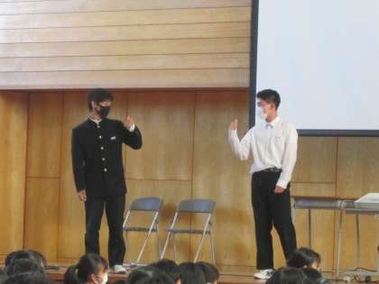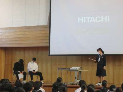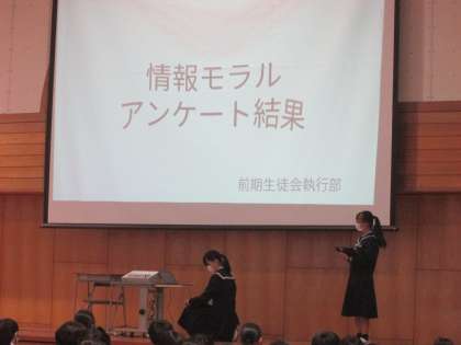 10/31(月) 6限 ネットモラル講座1 公開日 2022/10/31 更新日 2022/10/31 news 本日6限は、富山県警察本部生活安全部少年女性安全課の小暮さんにお越しいただき、生徒会執行部を中心に、ネットモラル講座を行いました。 写真は、生徒会執行部が情報モラルに関するアンケート結果を発表しているところと、よく起こっているネットトラブルを実演しているところです。