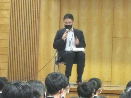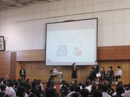 10/31(月) 6限 ネットモラル講座2 公開日 2022/10/31 更新日 2022/10/31 news 【写真上】ネットトラブル実演 【写真中】ネットトラブルについてのパネルディスカッションの様子 【写真下】小暮さんによるネットトラブル解説