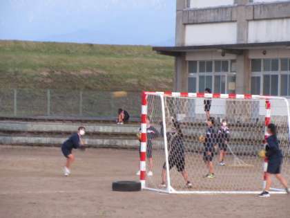 ハンドボール部は、ウォーミングアップのキャッチボールから始まり、最後は7mスローの練習で締めていました。