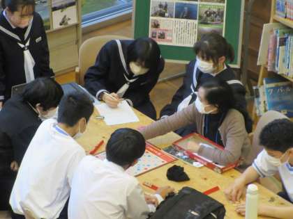 図書室では、ALTの先生を囲んで楽しそうに活動していました。また、自主学習に取り組んだり、読書したりする生徒でにぎわっていました。