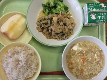 11月16日(水) 今日の給食 公開日 2022/11/16 更新日 2022/11/16 news 今日の給食のメニューは以下のとおりです。 ○麦ごはん ○牛乳 ○スタミナレバー丼 ○ゆでブロッコリー ○中華かき玉汁 ○りんご 「スタミナレバー丼」は、ボリューム満点でスタミナが付きました。