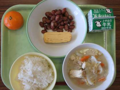 11月18日(金) 今日の給食 公開日 2022/11/18 更新日 2022/11/18 news 今日の給食のメニューは以下のとおりです。 ○ごはん ○牛乳 ○厚焼き卵 ○煮豆 ○塩こうじ鍋 ○みかん 万能調味料の塩こうじ。今日の鍋は最高でした。