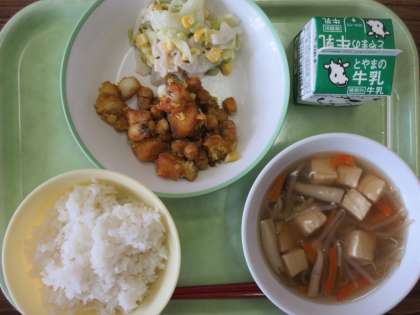 11月22日(火) 今日の給食 公開日 2022/11/22 更新日 2022/11/22 news 今日の給食のメニューは以下のとおりです。 ○ごはん ○牛乳 ○魚と豆のカレー揚げ ○れんこんサラダ ○豆腐スープ 「魚と豆のカレー揚げ」のカレーの香りで食欲が増しました。