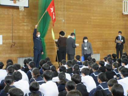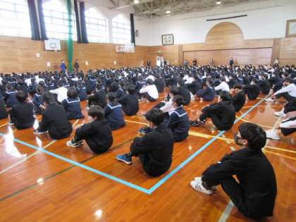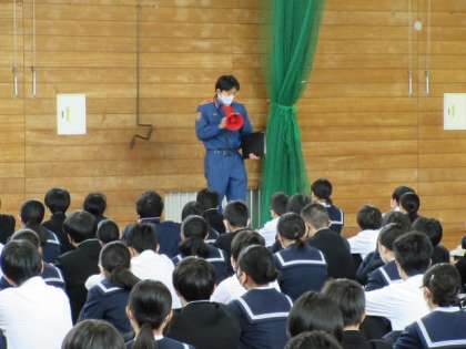 避難後はきれいに整列し、署員の方や鍋田校長の話をしっかり聞きました。