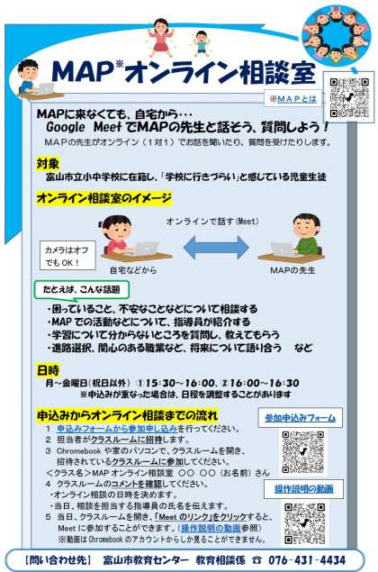 市教育センターでは、学校に行くづらいと感じている子どもたちを対象として、「MAPオンライン相談室」を実施いたします。MAP指導員に相談や質問ができるオンラインです。