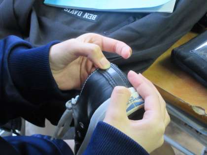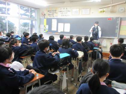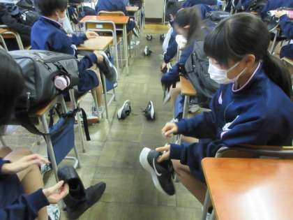新庄交番の所長さんから、「車からしっかり見えるように。自分の身を守ろう。」とお話があり、生徒たちは、嬉しそうに靴の後ろに反射材を貼り付けていました。