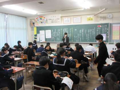 前半は、学年集会で3学期に行う「プロに学ぶ『13歳の発見』」のガイダンスを行いました。