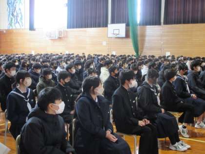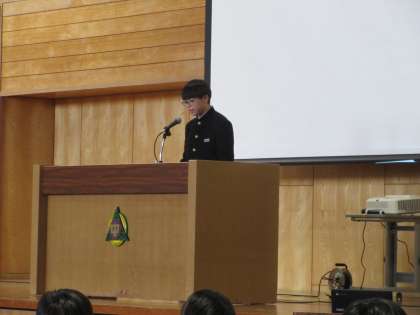 2学期に執行委員に立候補した経験を振り返り、挑戦することの大切さ、支えてくれる友達の大切さについて発表しました。「様々なことにチャレンジできる学校は理想の学校」とし、生徒会活動への意気込みが伝わってきました。3学期も生徒主体の活動で、活気ある学校を作り上げていってくれることを期待します。